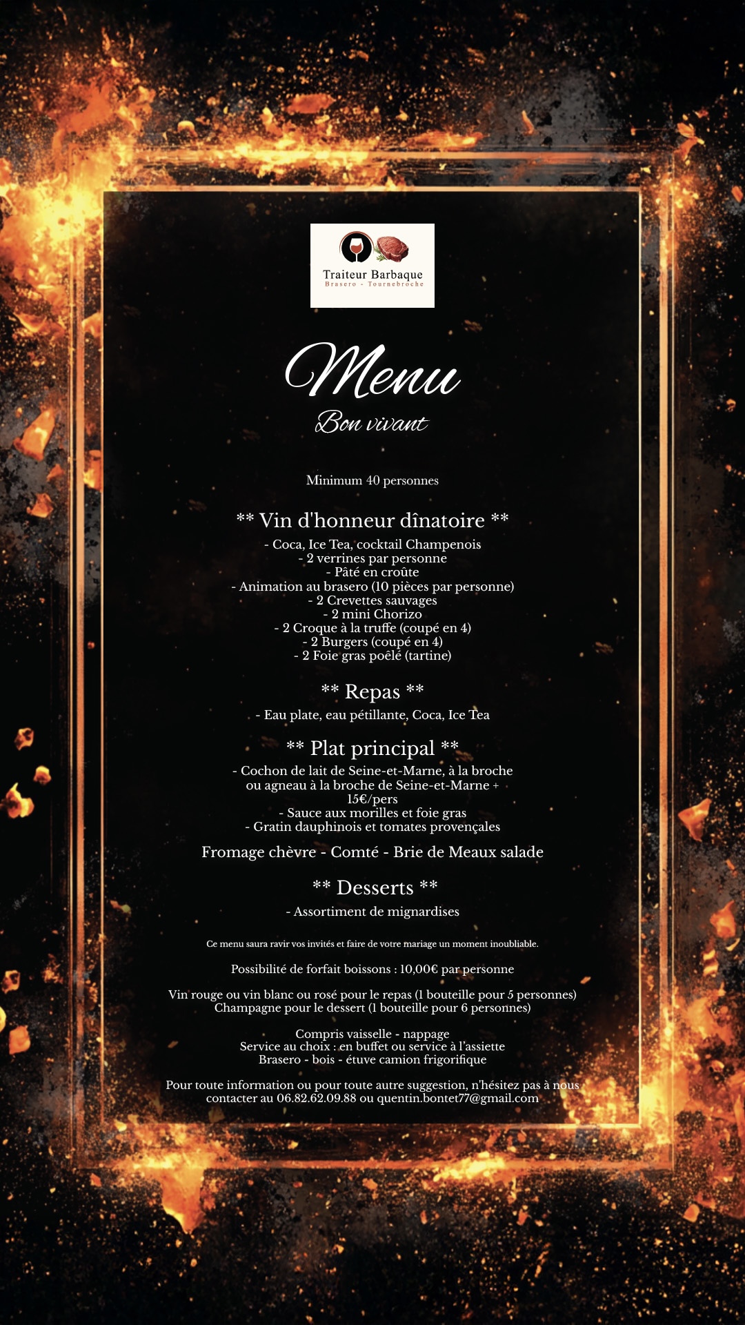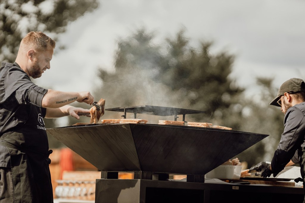 Nous concevons des prestations complètes, alliant la puissance visuelle de la cuisson au feu de bois, au brasero ou au tournebroche à l’élégance d’un service à l’assiette. Chaque création est travaillée avec précision, depuis la sélection des pièces jusqu’à la parfaite maîtrise des cuissons, afin d’offrir une assiette généreuse, raffinée et mémorable.